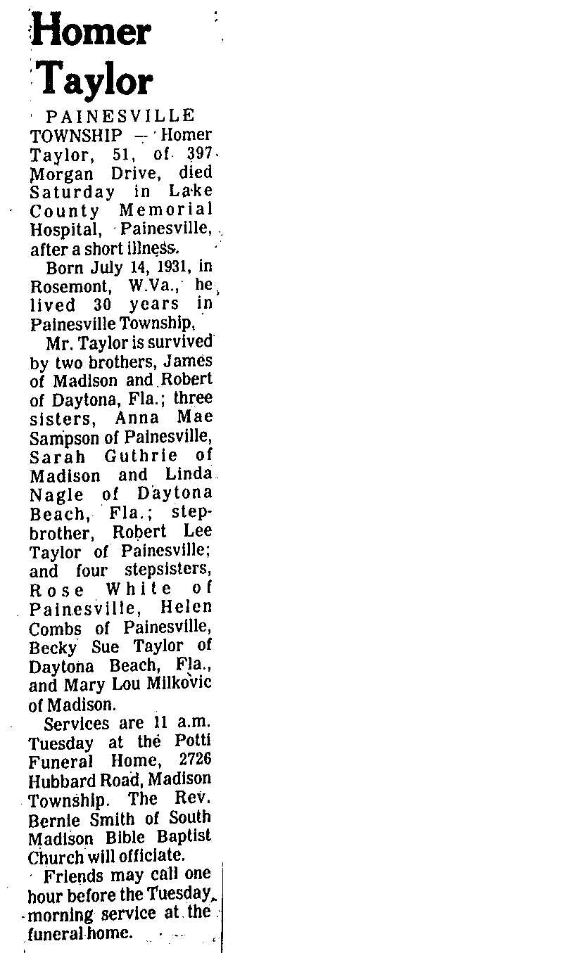 Taylor, Homer Obituary, Taylor, Homer Obituary (Telegraph 05/23/1983)