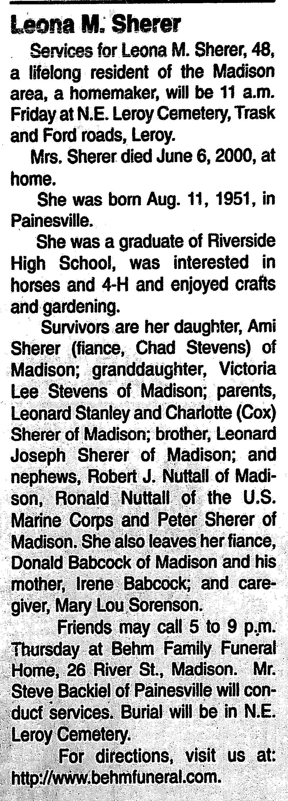 Sherer, Leona Obituary, Sherer, Leona Obituary (News-Herald 06/06/2000)
