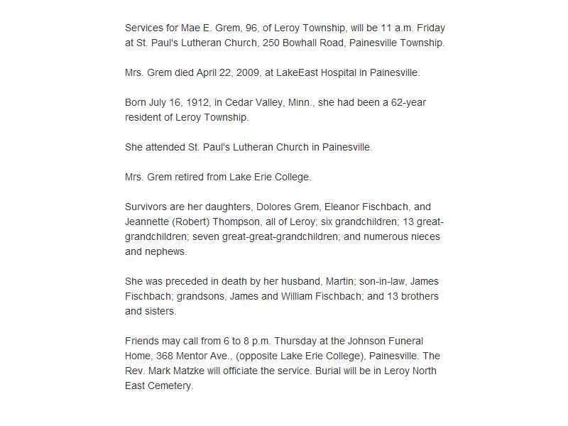 Grem, Mae Obituary, Grem, Mae Obituary (News-Herald 04/23/2009)