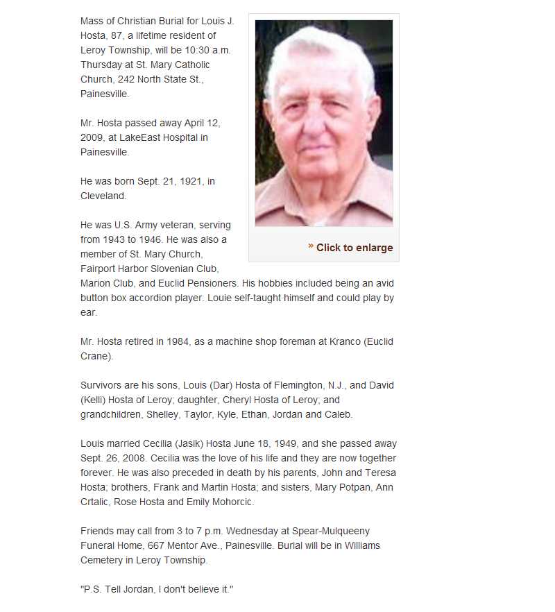 Hosta, Louis Obituary, Hosta, Louis Obituary (News-Herald 04/14/2009)