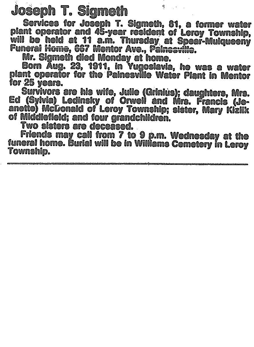 Sigmeth, Joseph Obituary, Sigmeth, Joseph Obituary (News-Herald 02/09/1993)