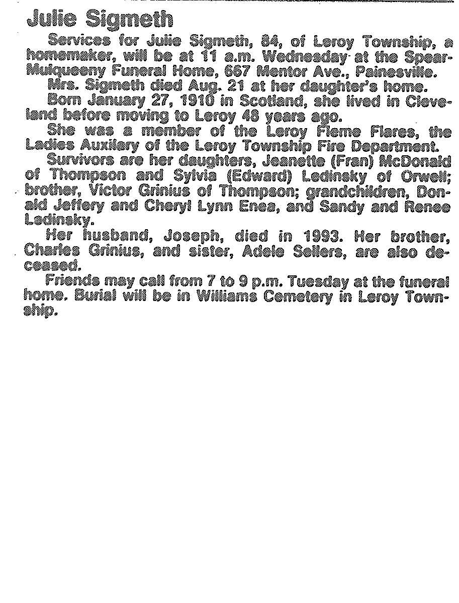 Sigmeth, Julie Obituary, Sigmeth, Julie Obituary (News-Herald 08/22/1994)