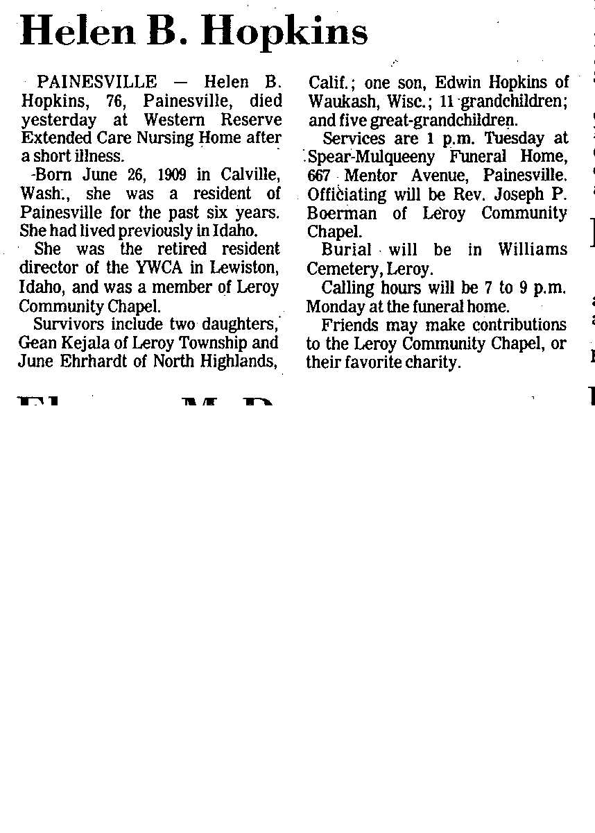 Hopkins, Helen Obituary, Hopkins, Helen Obituary (Telegraph 11/10/1985)