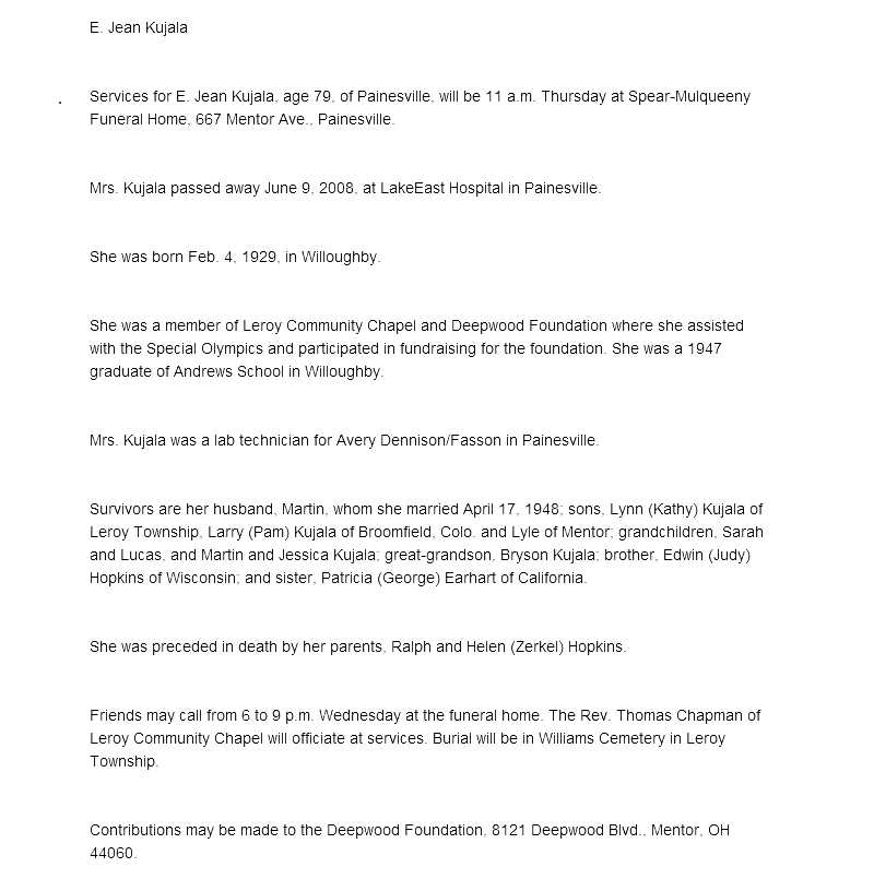 Kujala, Jean Obituary, Kujala, Jean Obituary (News-Herald 06/10/2008)