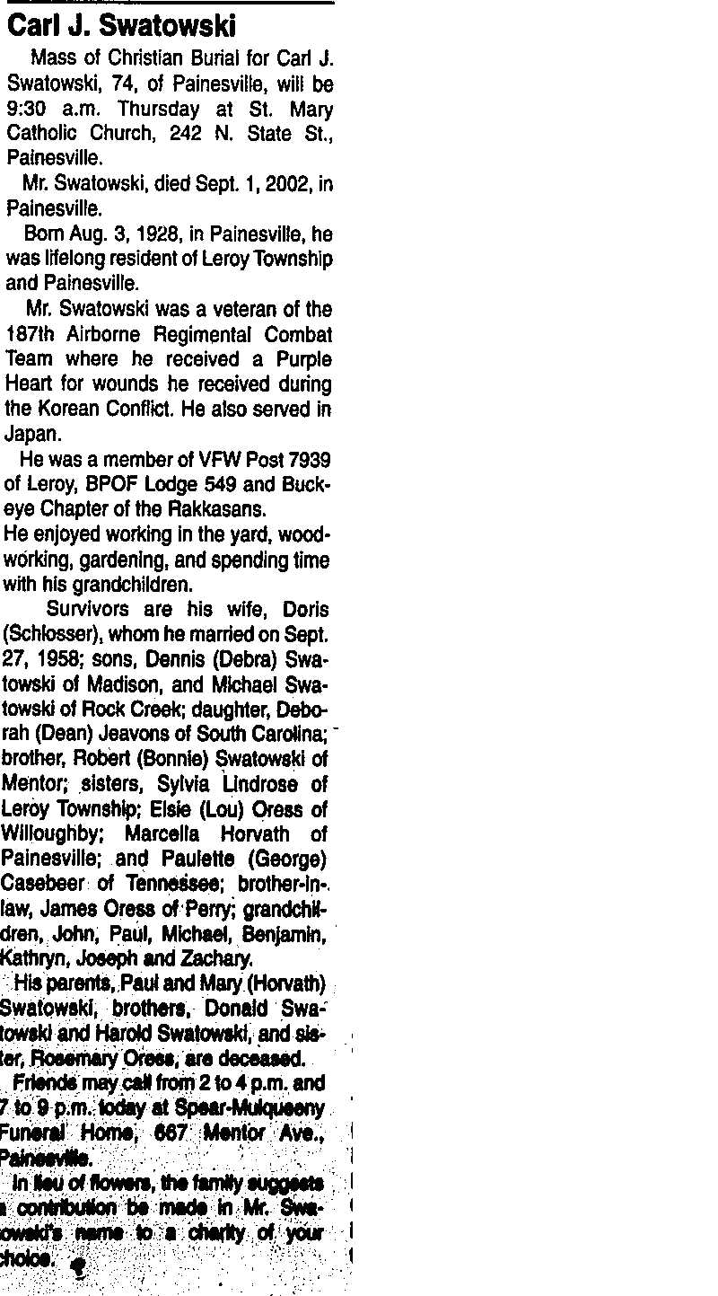 Swatowski, Carl Obituary, Swatowski, Carl Obituary (News-Herald 09/04/2002)