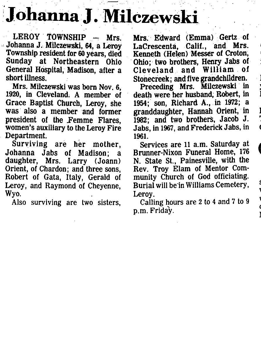 Milczewski, Johanna Obituary, Milczewski, Johanna Obituary (Telegraph 05/14/1985)