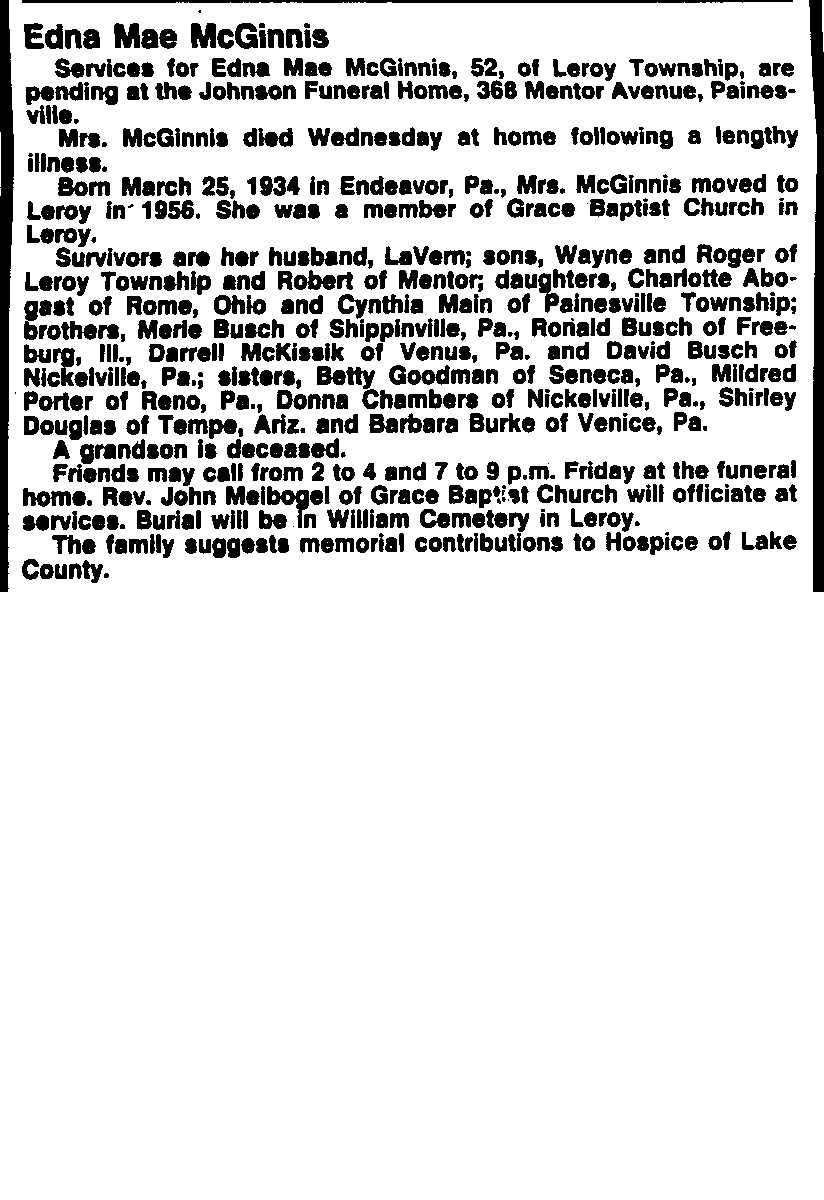 McGinnis, Edna Obituary, McGinnis, Edna Obituary (News-Herald 01/08/1987)
