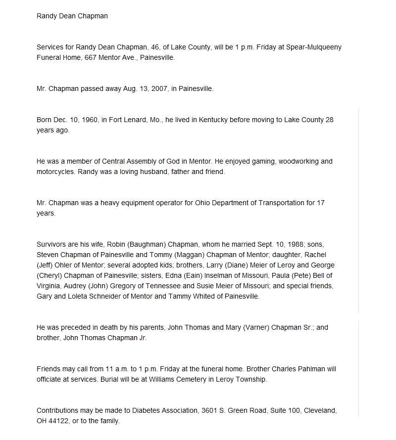 Chapman, Randy Obiturary, Chapman, Randy Obiturary (News-Herald 08/15/2007)