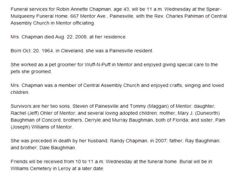Chapman, Robin A Obiturary, Chapman, Robin A Obiturary (News-Herald 08/24/2008)