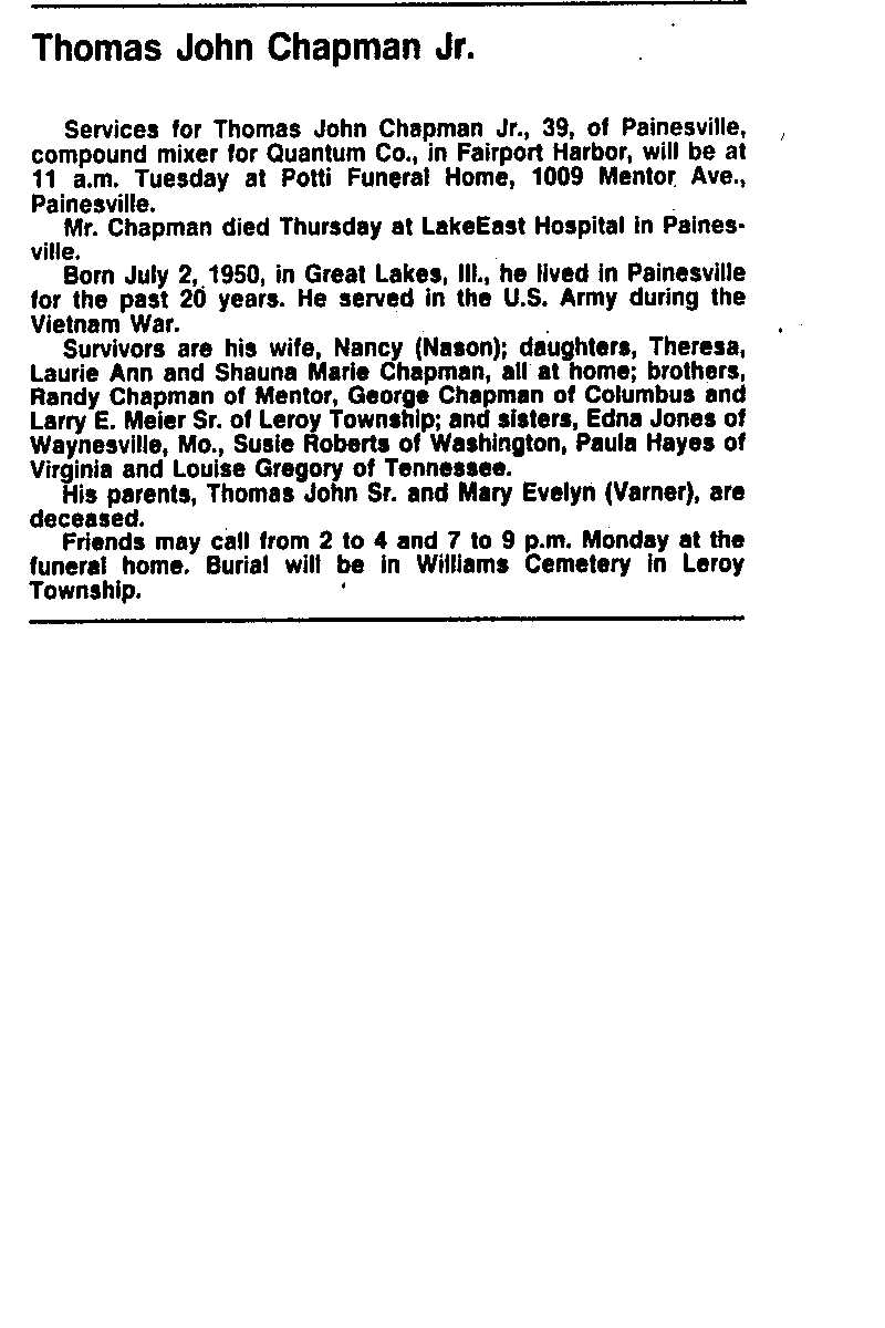 Chapman, Thomas Obituary, Chapman, Thomas Obituary (News-Herald 07/29/1989)