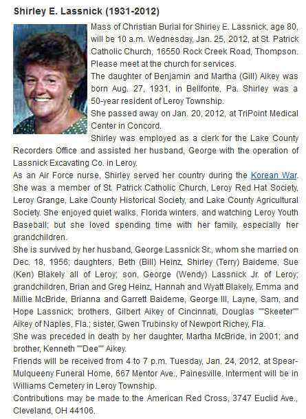 Shirley Lassnick Obituary, Shirley Lassnick Obituary (News-Herald 01/23/2012)