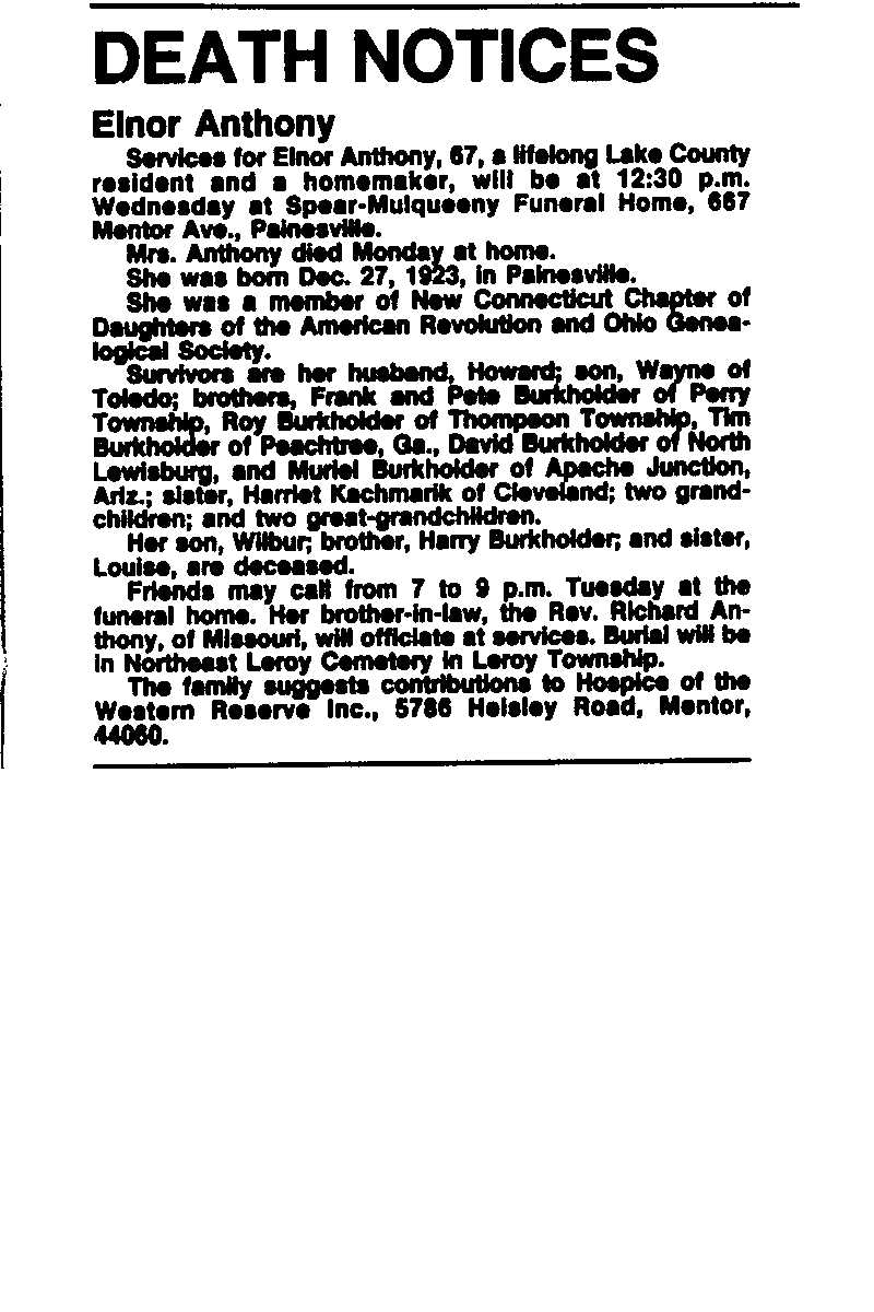 Anthony, Elnor Obituary, Anthony, Elnor Obituary (News-Herald 09/17/1991)