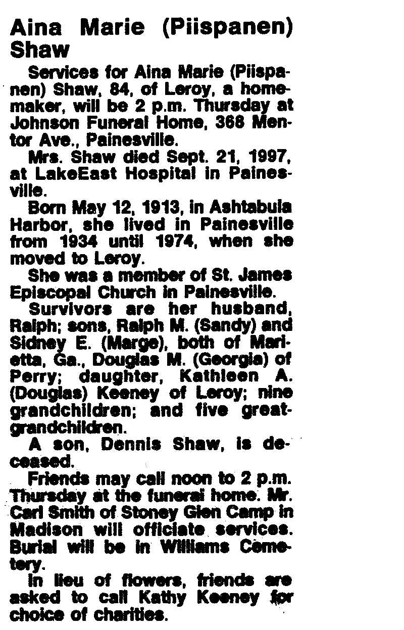 Shaw, Aina Obituary, Shaw, Aina Obituary (News-Herald 09/24/2997)