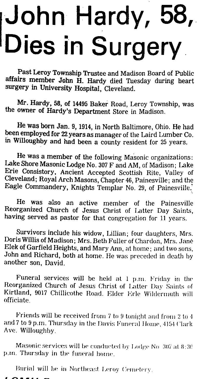 Hardy, John Obituary, Hardy, John Obituary (Telegraph 11/15/1972)
