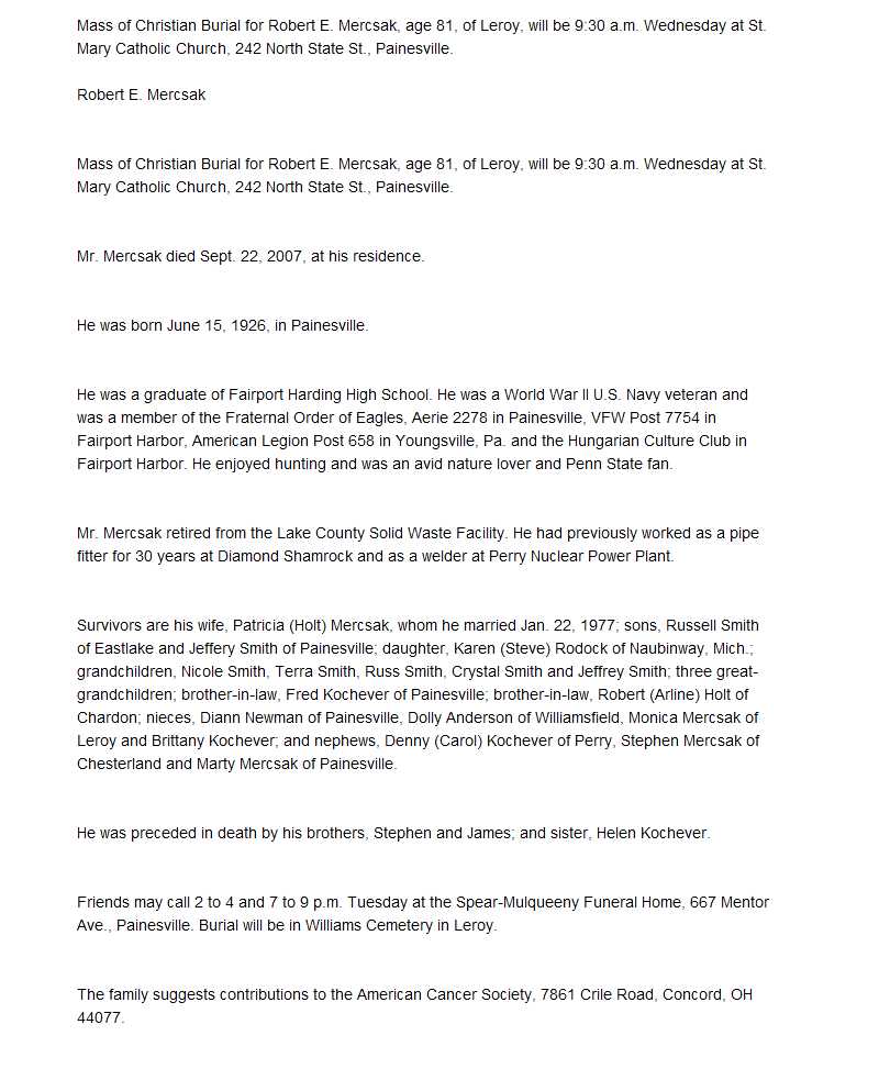 Mercsak, Robert Obituary, Mercsak, Robert Obituary (News-Herald 09/25/2007)