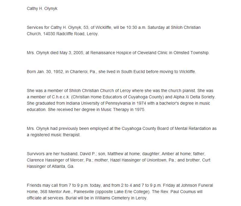 Olynyk, Cathy Obituary, Olynyk, Cathy Obituary (News-Herald 05/05/2005)