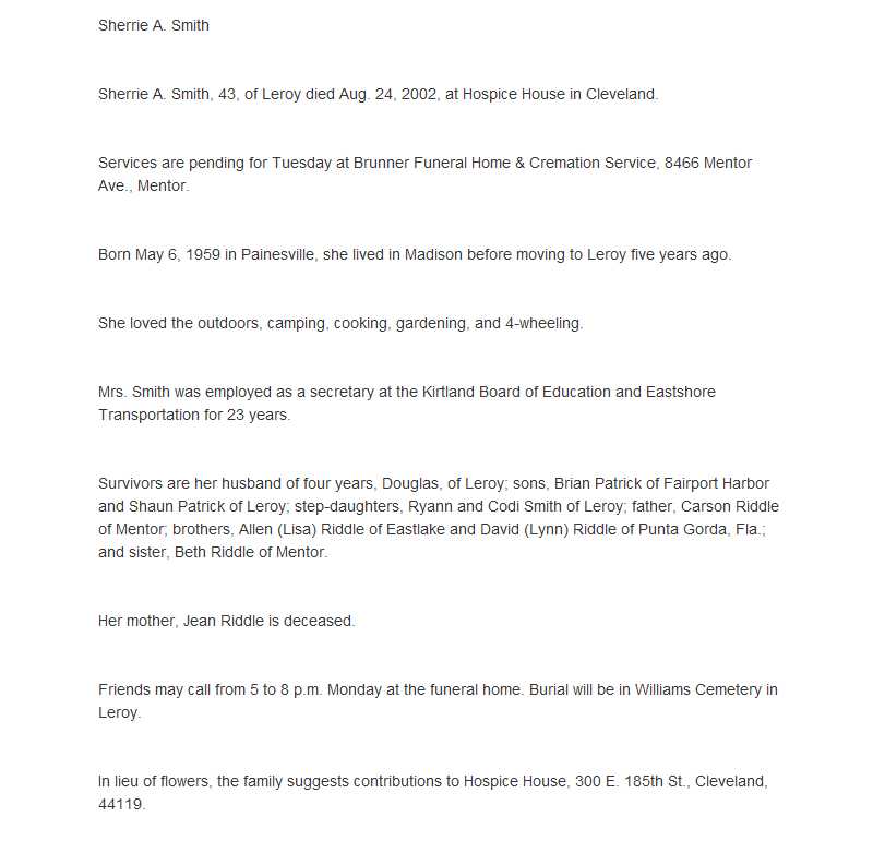 Smith, Sherrie Obituary, Smith, Sherrie Obituary (News-Herald 08/25/2002)
