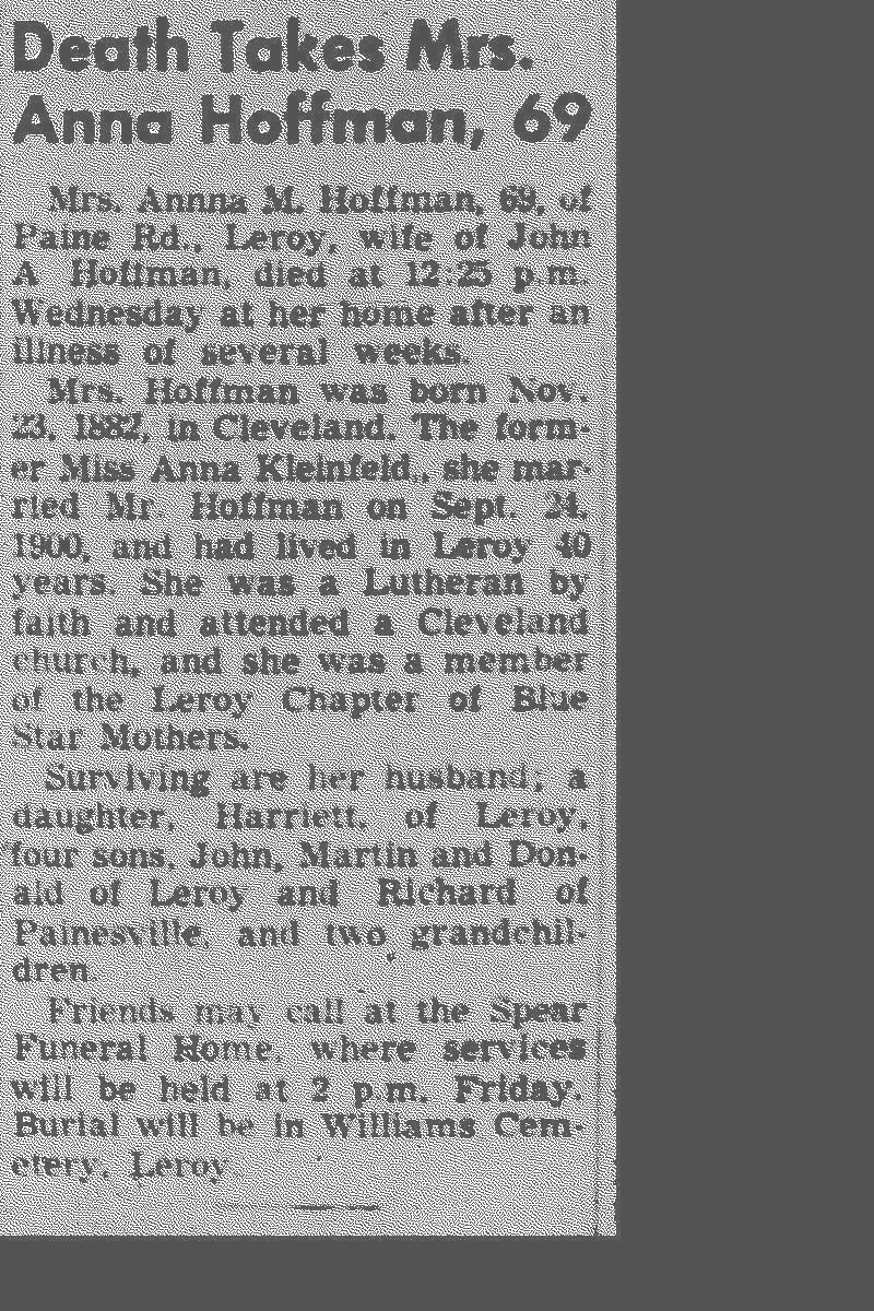 Hoffman, Anna Obituary, Hoffman, Anna Obituary (Telegraph 01/30/1952)