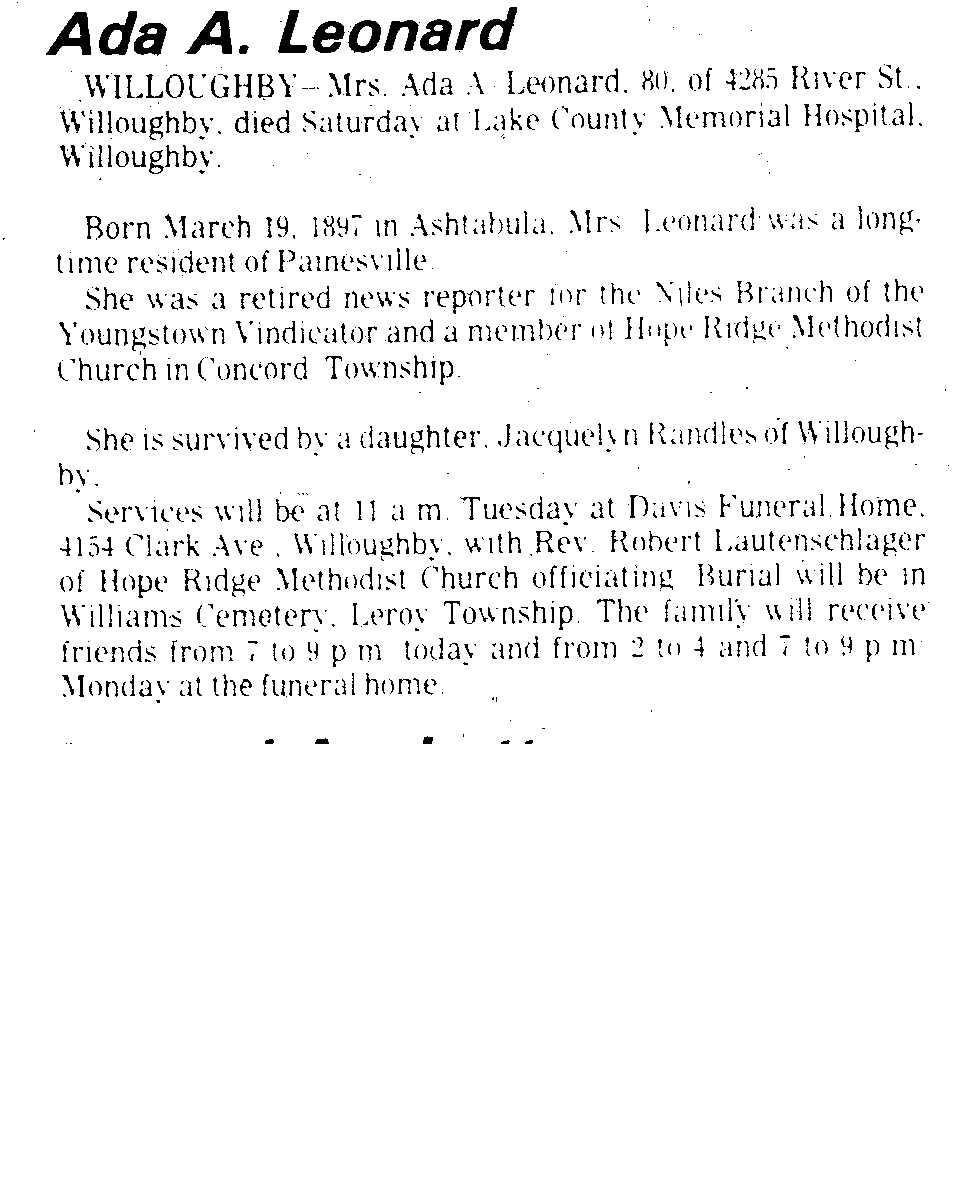 Leonard, Ada Obituary, Leonard, Ada Obituary (Telegraph 11/06/1977)