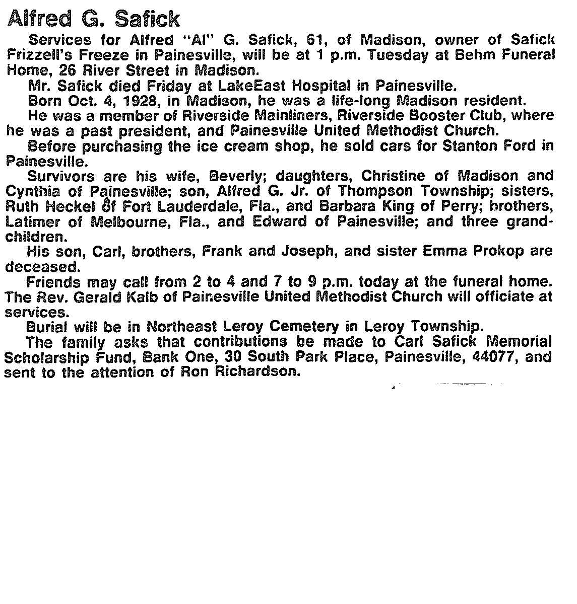 Alfred Safick SR Obituary, Alfred Safick SR Obituary (News-Herald 07/01/1990)