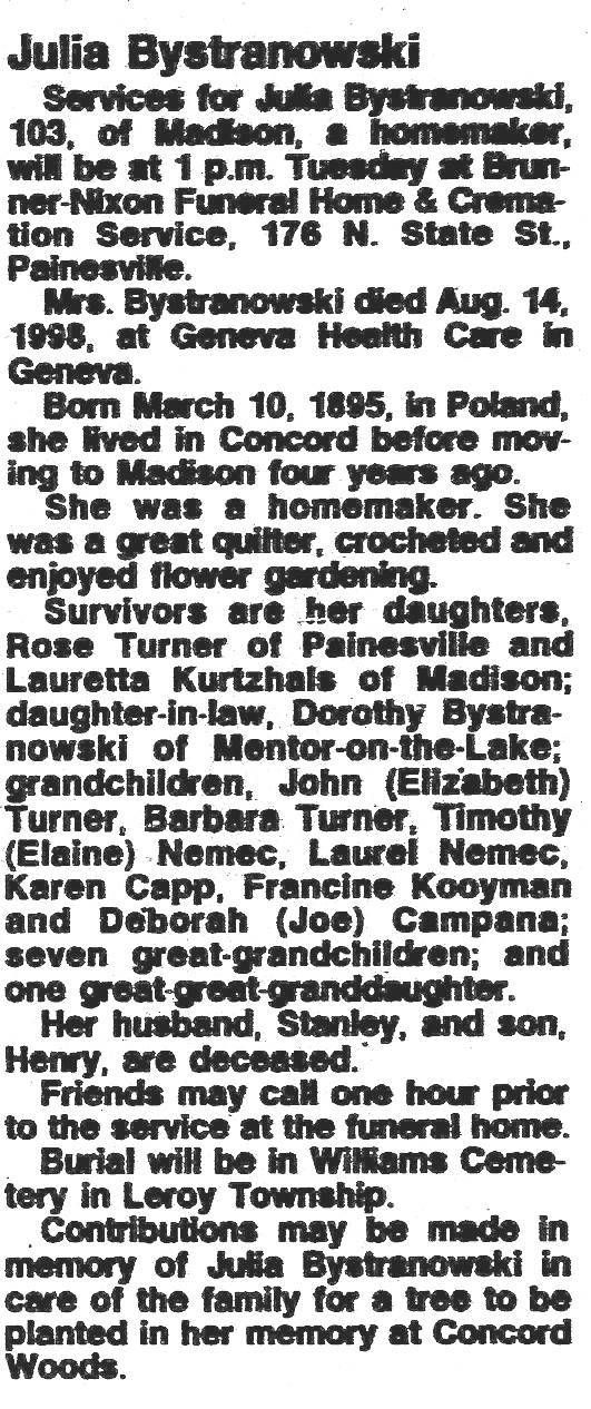 Bystranowski, Julia Obituary, Bystranowski, Julia Obituary (News-Herald 08/17/1998)