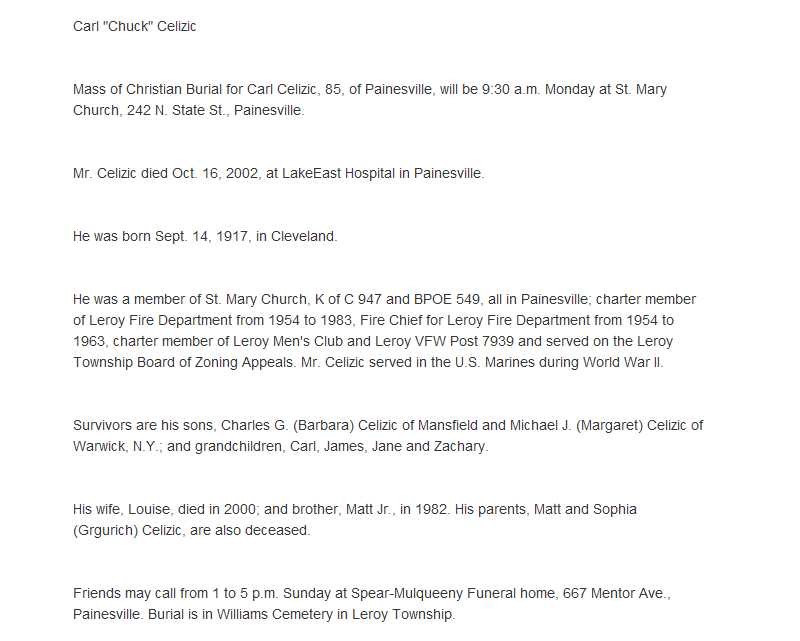 Celizic, Carl Obituary, Celizic, Carl Obituary (News-Herald 10/18/2002)