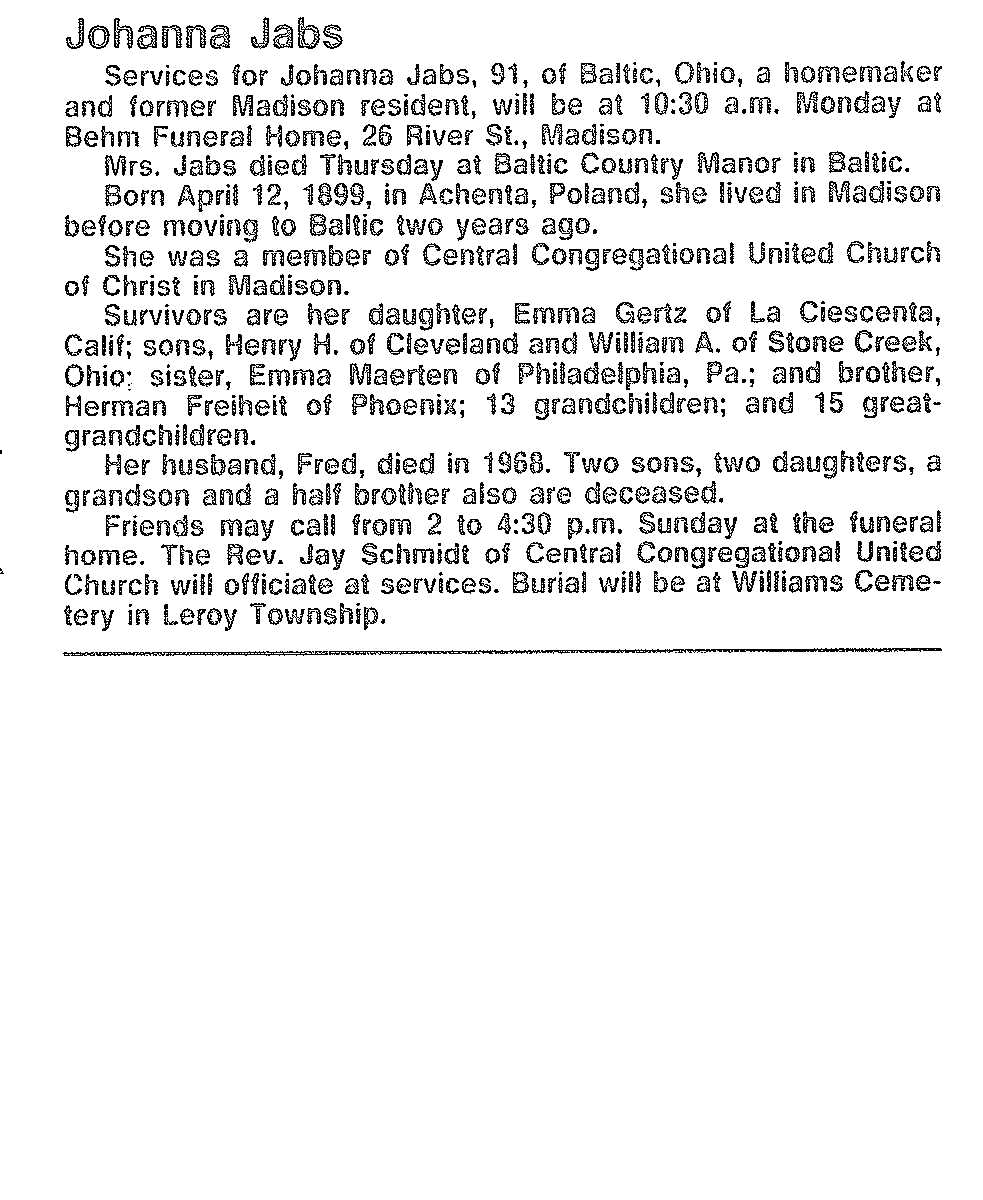 Jabs, Johanna Obituary, Jabs, Johanna Obituary (News-Herald 09/29/1990)