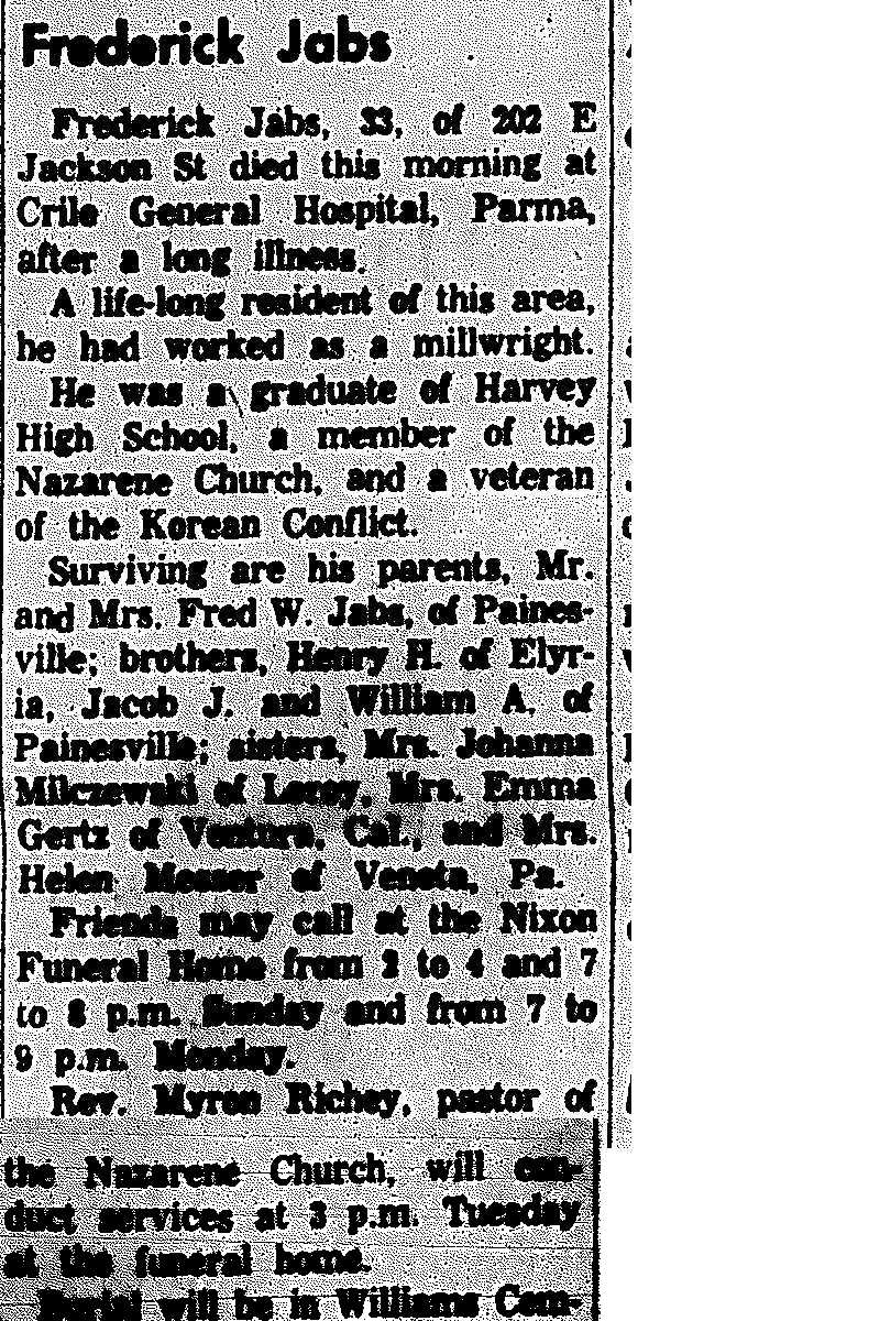 Jabs, Fredrick Obituary, Jabs, Fredrick Obituary (Telegraph 11/11/1961)