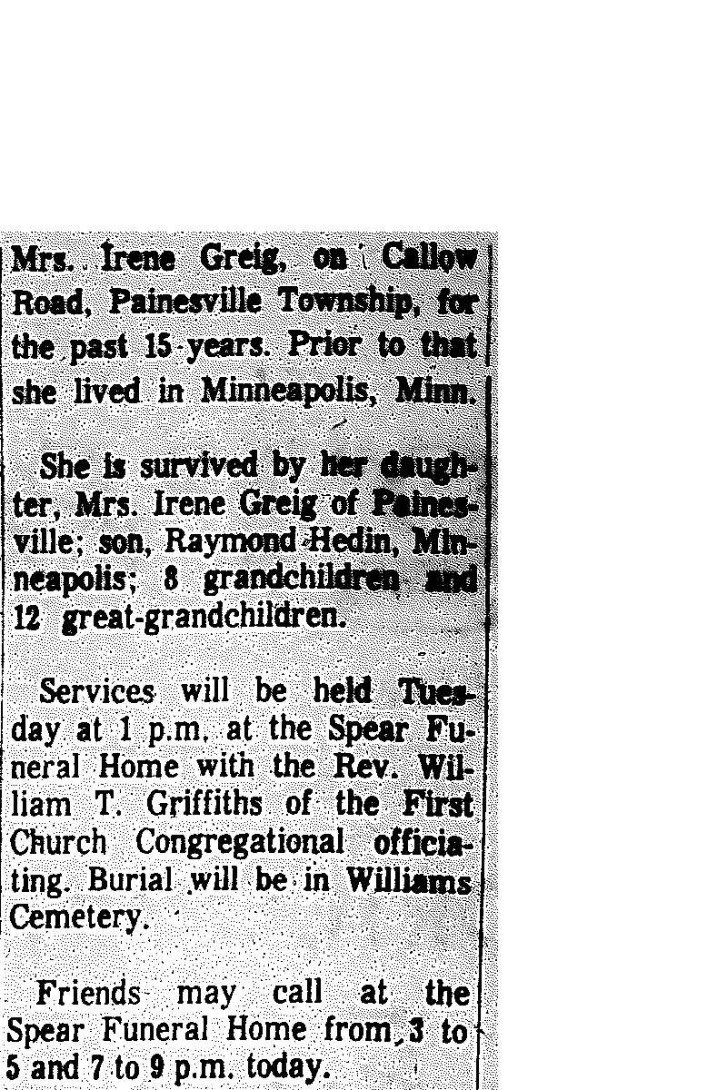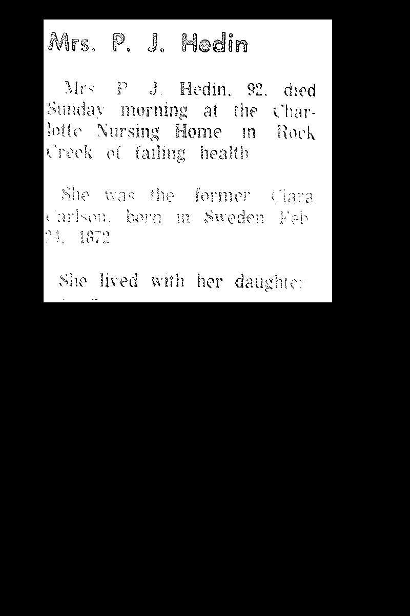 Hedin, Clara Obituary, Hedin, Clara Obituary (Telegraph 02/15/1965)