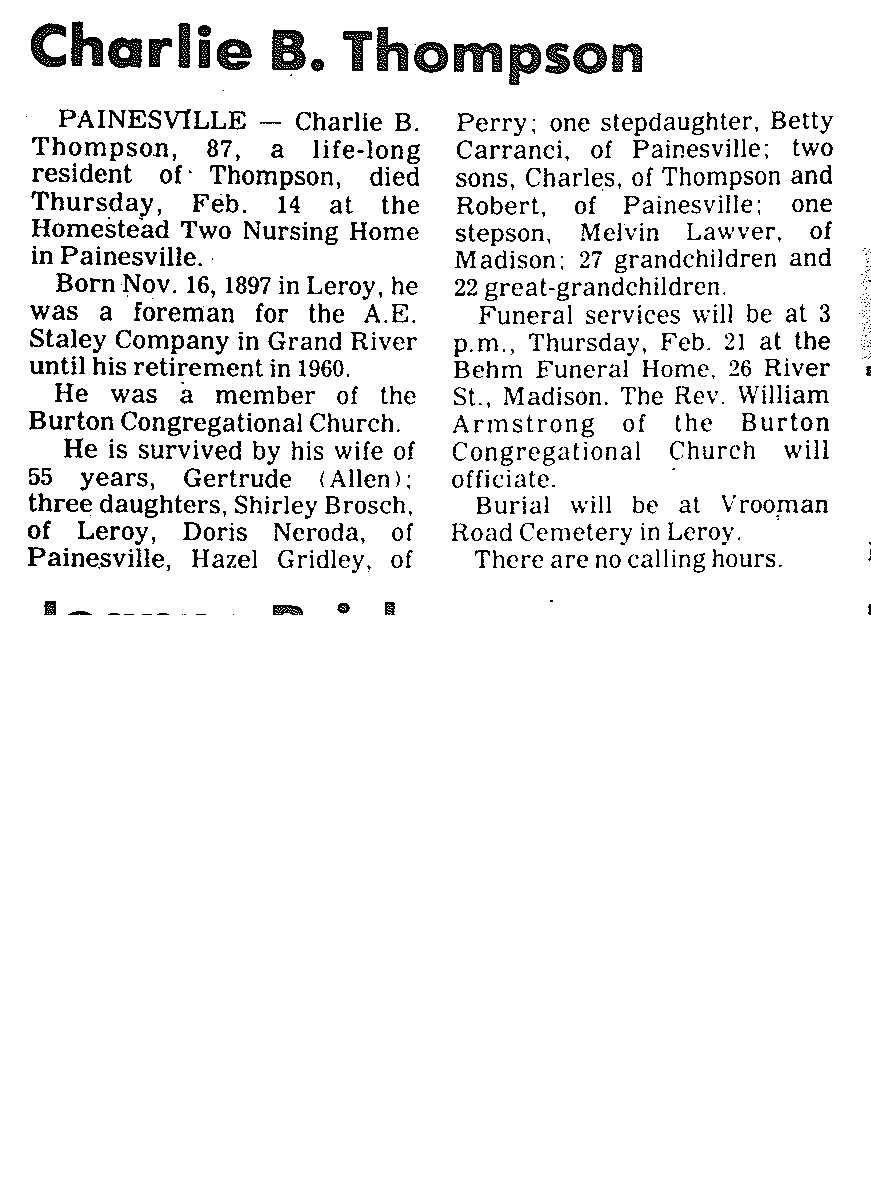 Thompson, Charlies Obituary, Thompson, Charlies Obituary (Telegraph 02/16/1985)