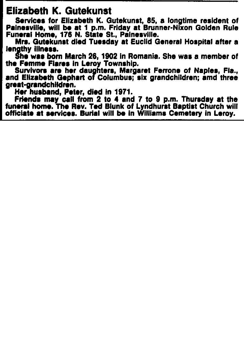 Gutekunst, Elizabeth Obituary, Gutekunst, Elizabeth Obituary (News-Herald 05/20/1987)
