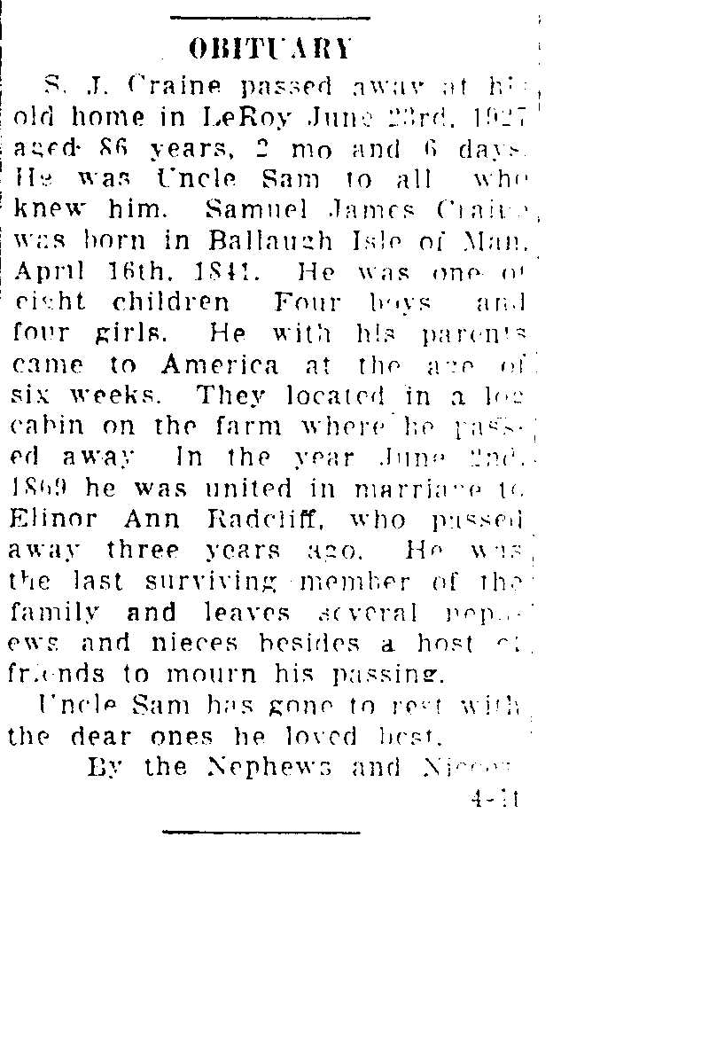 Craine, Samuel Obituary, Craine, Samuel Obituary (Telegraph 07/20/1927)