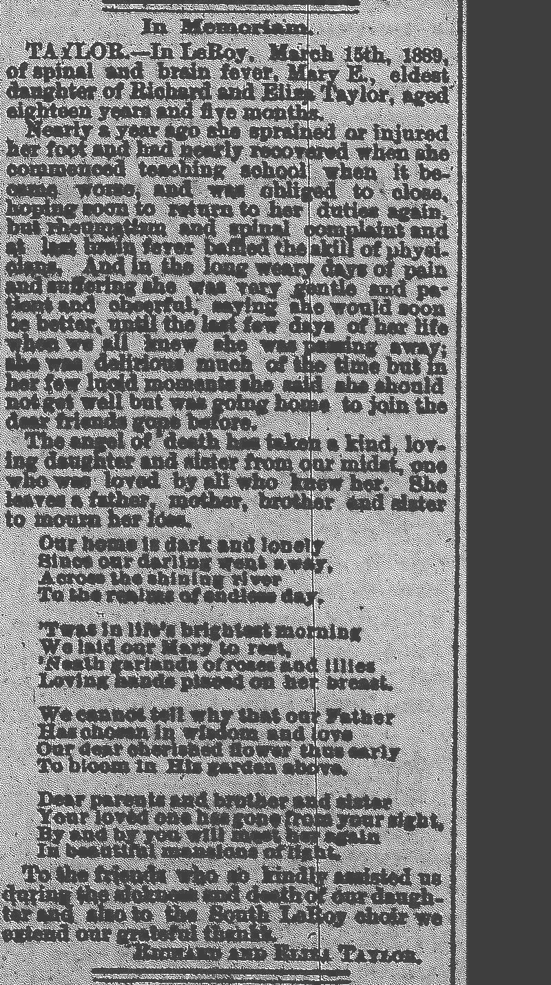 Taylor, Mary Obituary, Taylor, Mary Obituary (Telegraph 1889 #18)