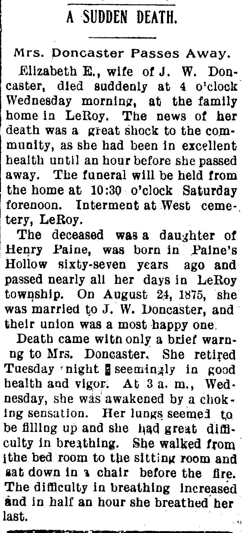 Doncaster, Elizabeth Obituary, Doncaster, Elizabeth Obituary (Telegraph 11/19/1903)