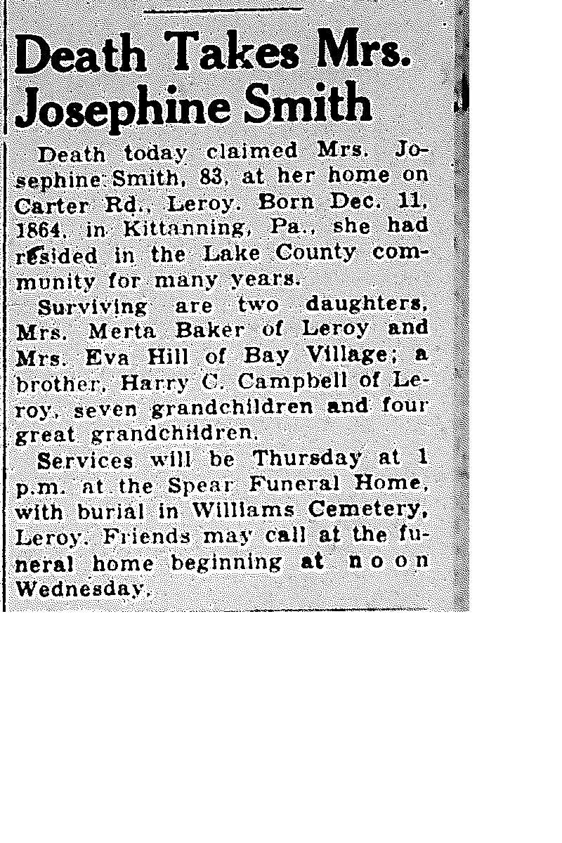 Smith, Josephine Obituary, Smith, Josephine Obituary (Telegraph 10/19/1948)