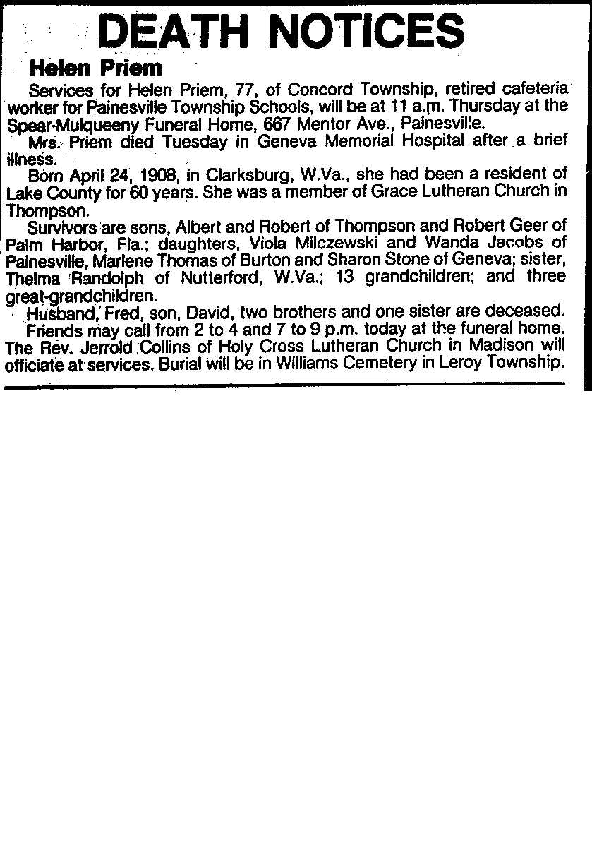 Priem, Helen Obituary, Priem, Helen Obituary (Telegraph 04/02/1986)