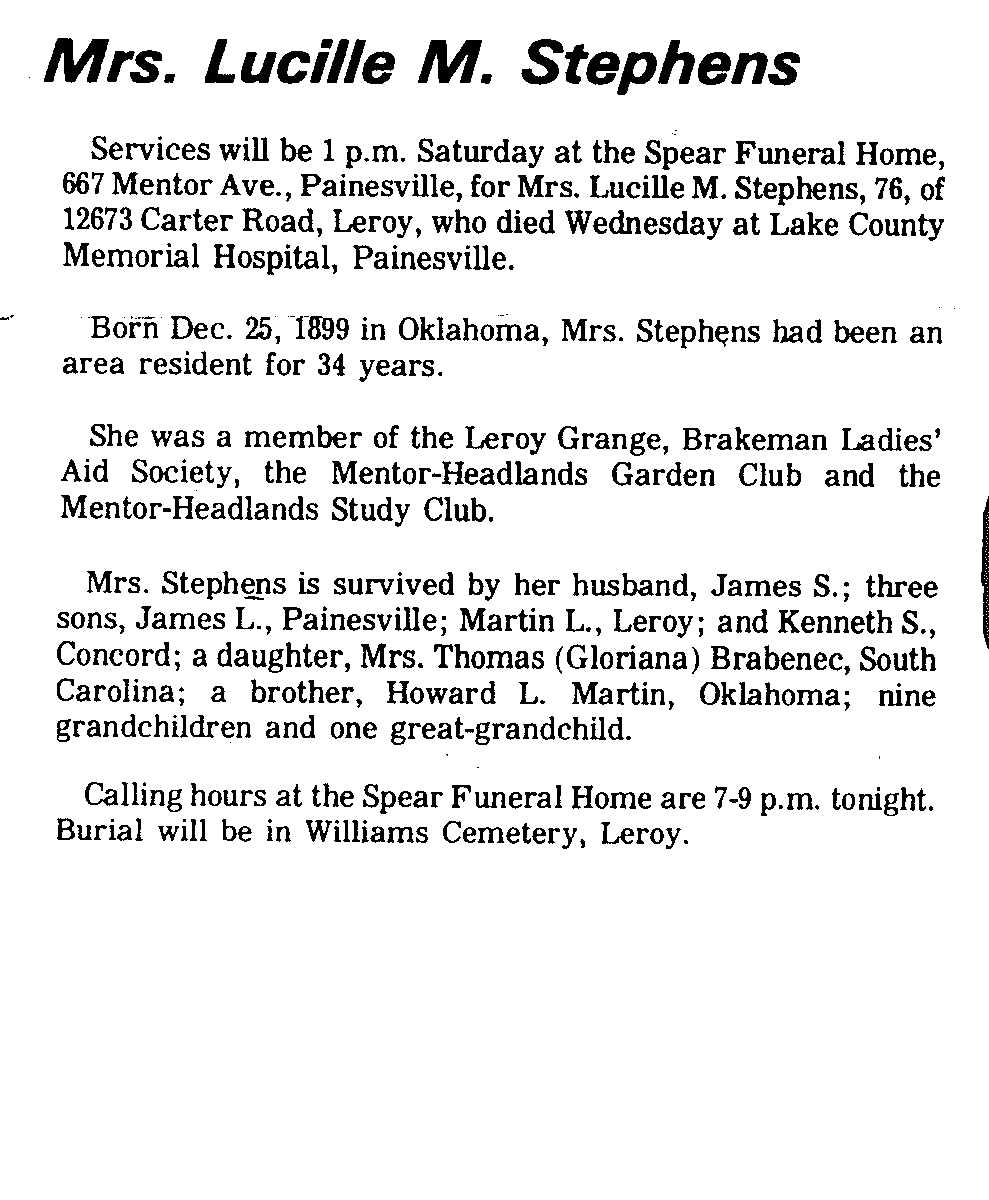 Stephens, Lucille Obituary, Stephens, Lucille Obituary (Telegraph 06/11/1976)