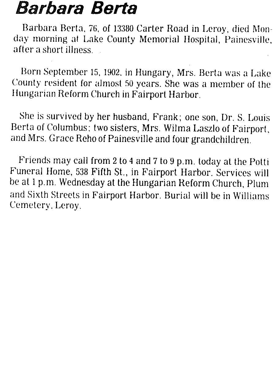Berta, Barbara Obituary, Berta, Barbara Obituary (Telegraph 11/21/1978)