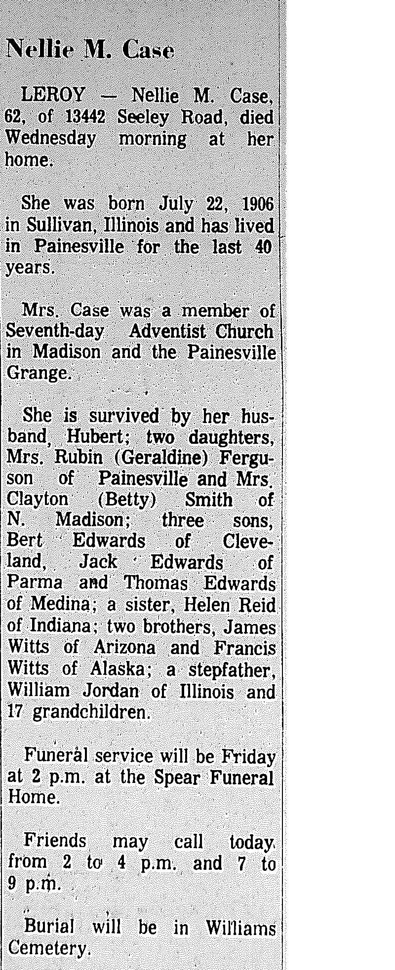 Case Nellie Obituary, Case Nellie Obituary (Telegraph 02/06/1969)