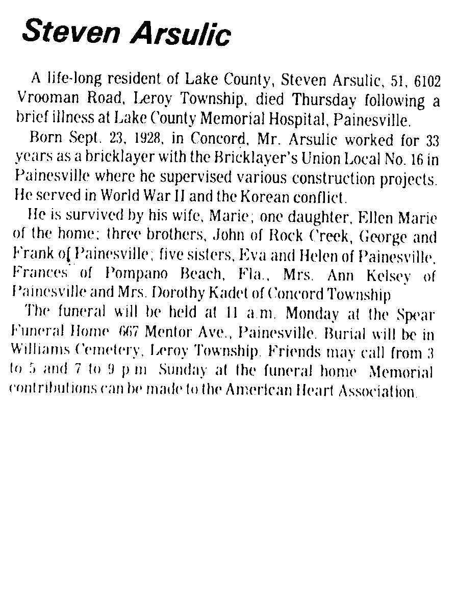 Arsulic, Steve Obituary, Arsulic, Steve Obituary (Telegraph 08/23/1980)