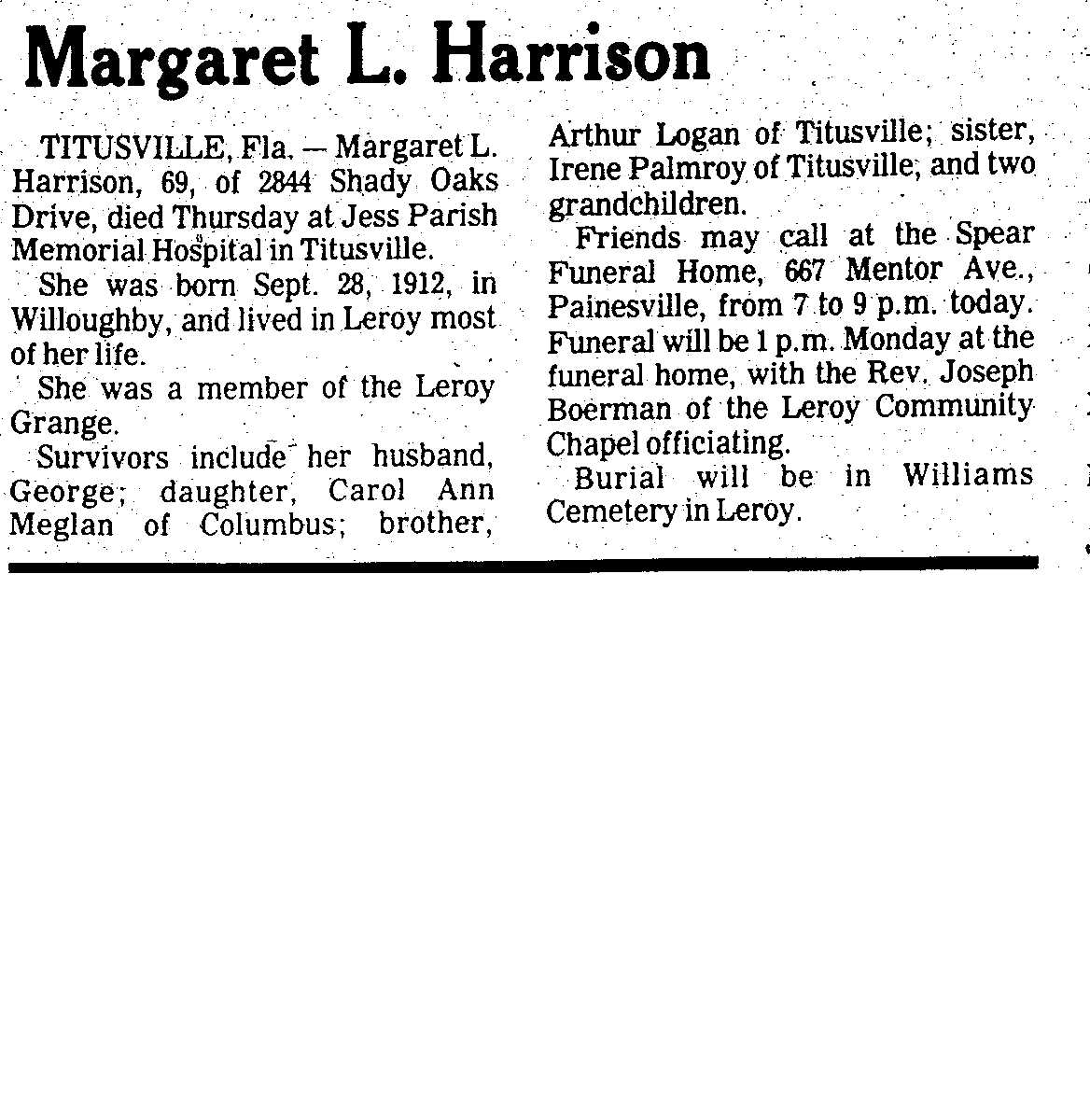 Harrison, Margaret Obituary, Harrison, Margaret Obituary (Telegraph 10/18/1981)
