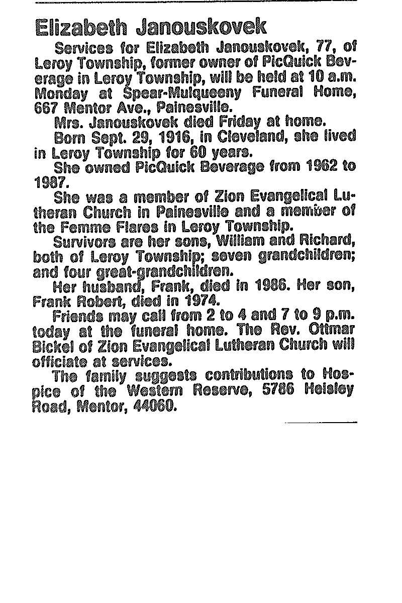 Janouskovec, Elizabeth Obituary, Janouskovec, Elizabeth Obituary (News-Herald 10/31/1993)