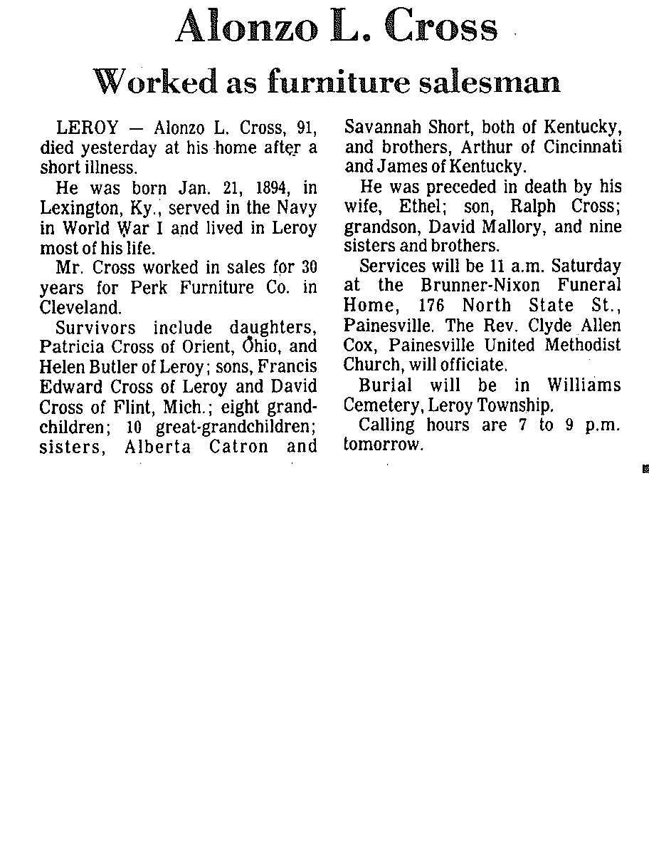 Cross, Alonzo Obituary, Cross, Alonzo Obituary (Telegraph 08/15/1985)