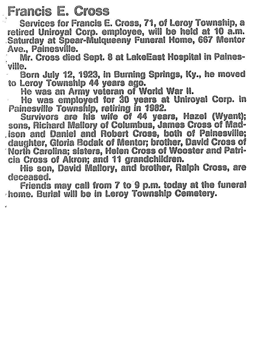 Cross, Francis Obituary, Cross, Francis Obituary (News-Herald 09/09/1994)