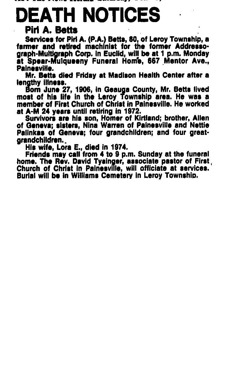 Betts, Pirl Obituary, Betts, Pirl Obituary (News-Herald 10/18/1986)