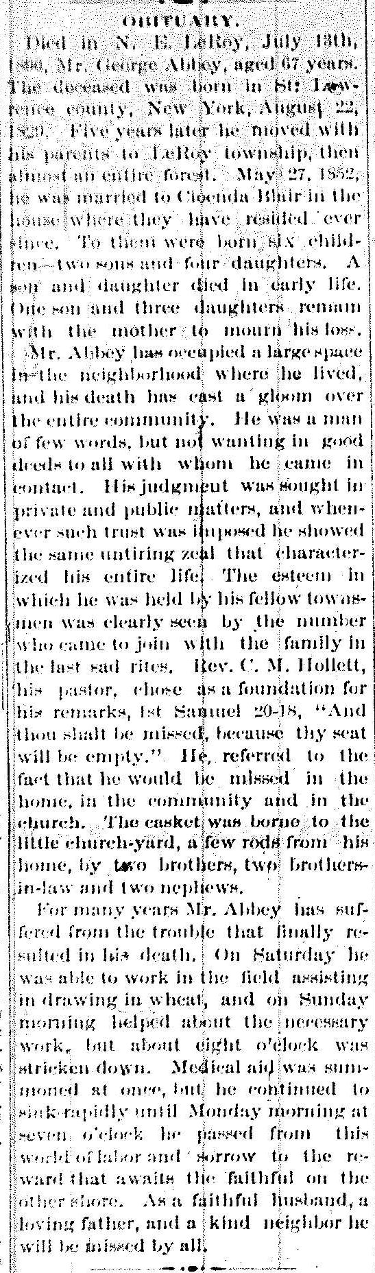 Abbey, George Obiturary, Abbey, George Obiturary (Leroy History Notebook)