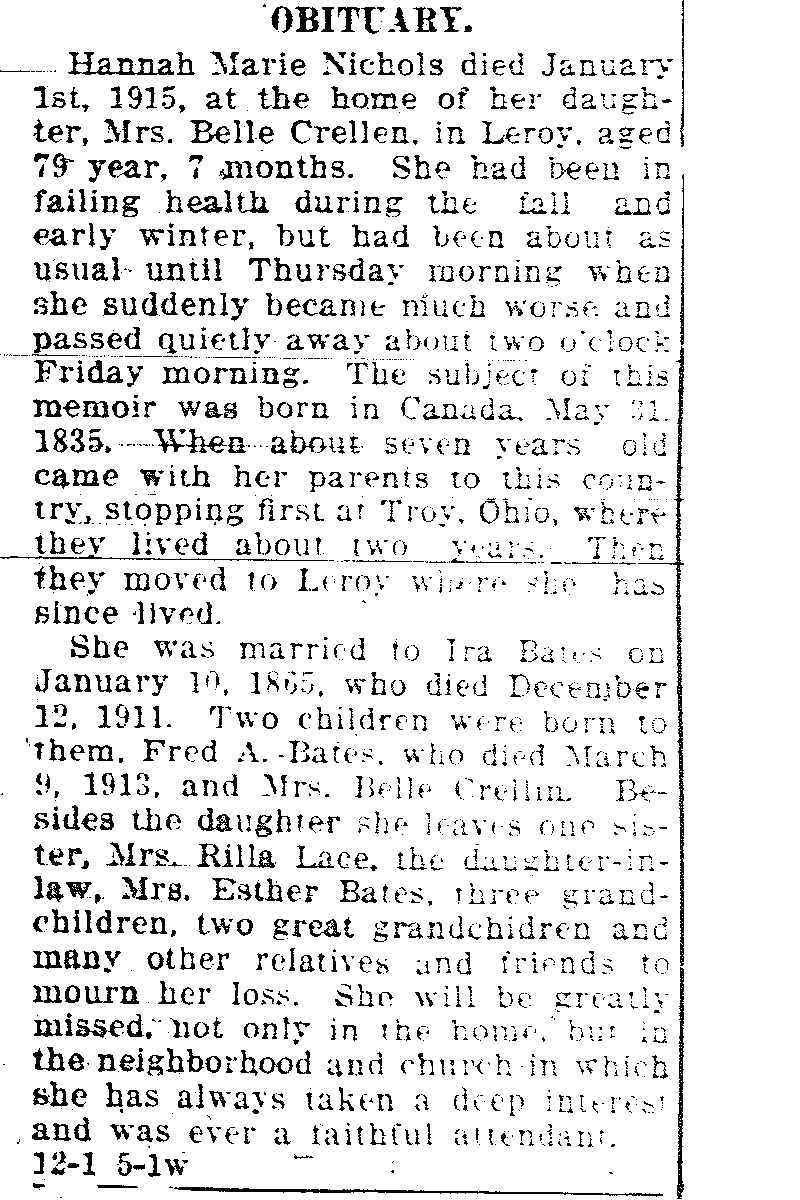 Bates, Hannah Obituary2, Bates, Hannah Obituary2 (Telegraph 01/15/1915)