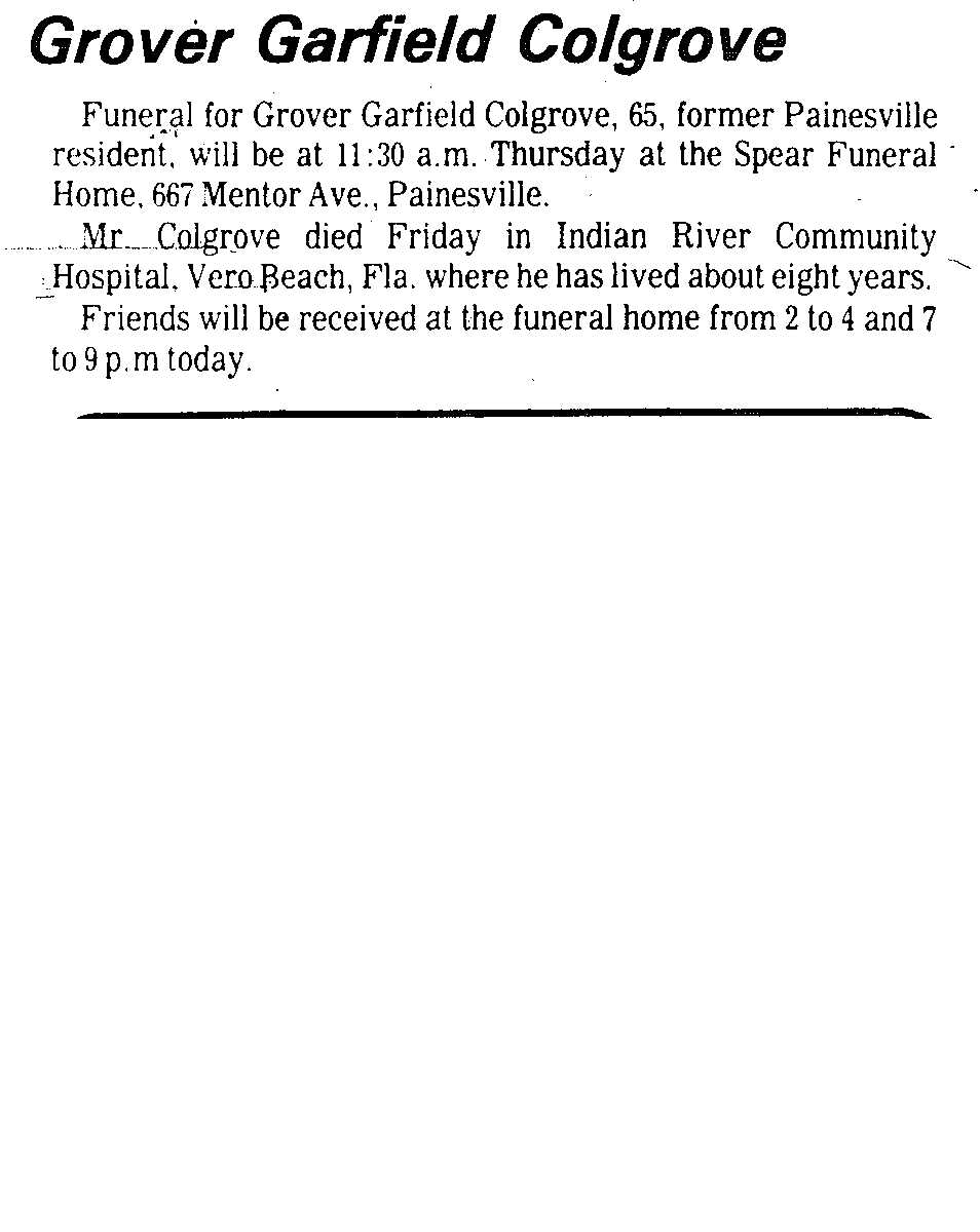 Colgrove, Grover Obituary, Colgrove, Grover Obituary (Telegraph 12/03/1980)