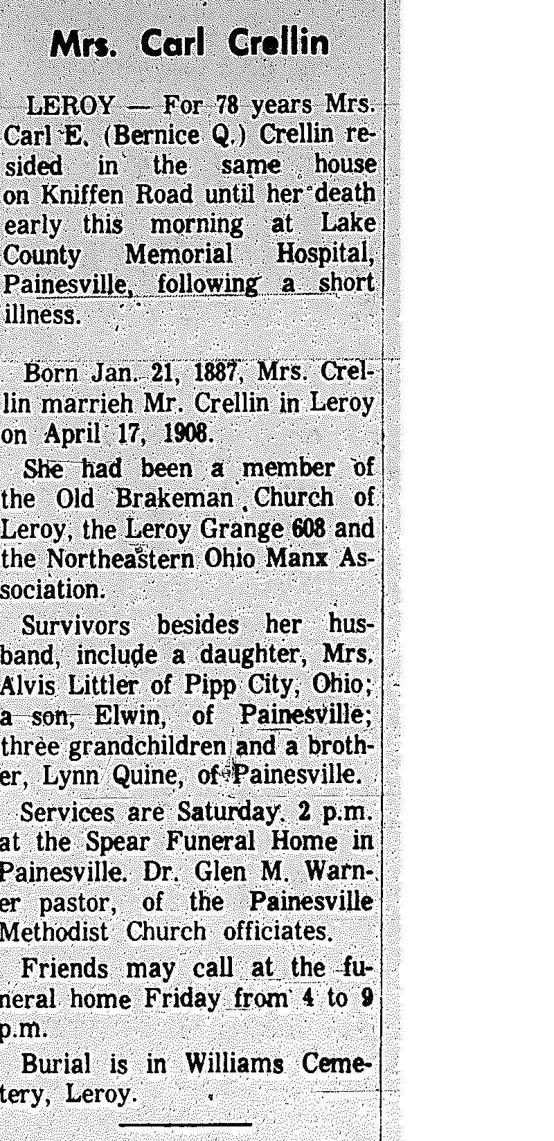 Crellin, Bernice Obituary, Crellin, Bernice Obituary (Telegraph 09/02/1965)