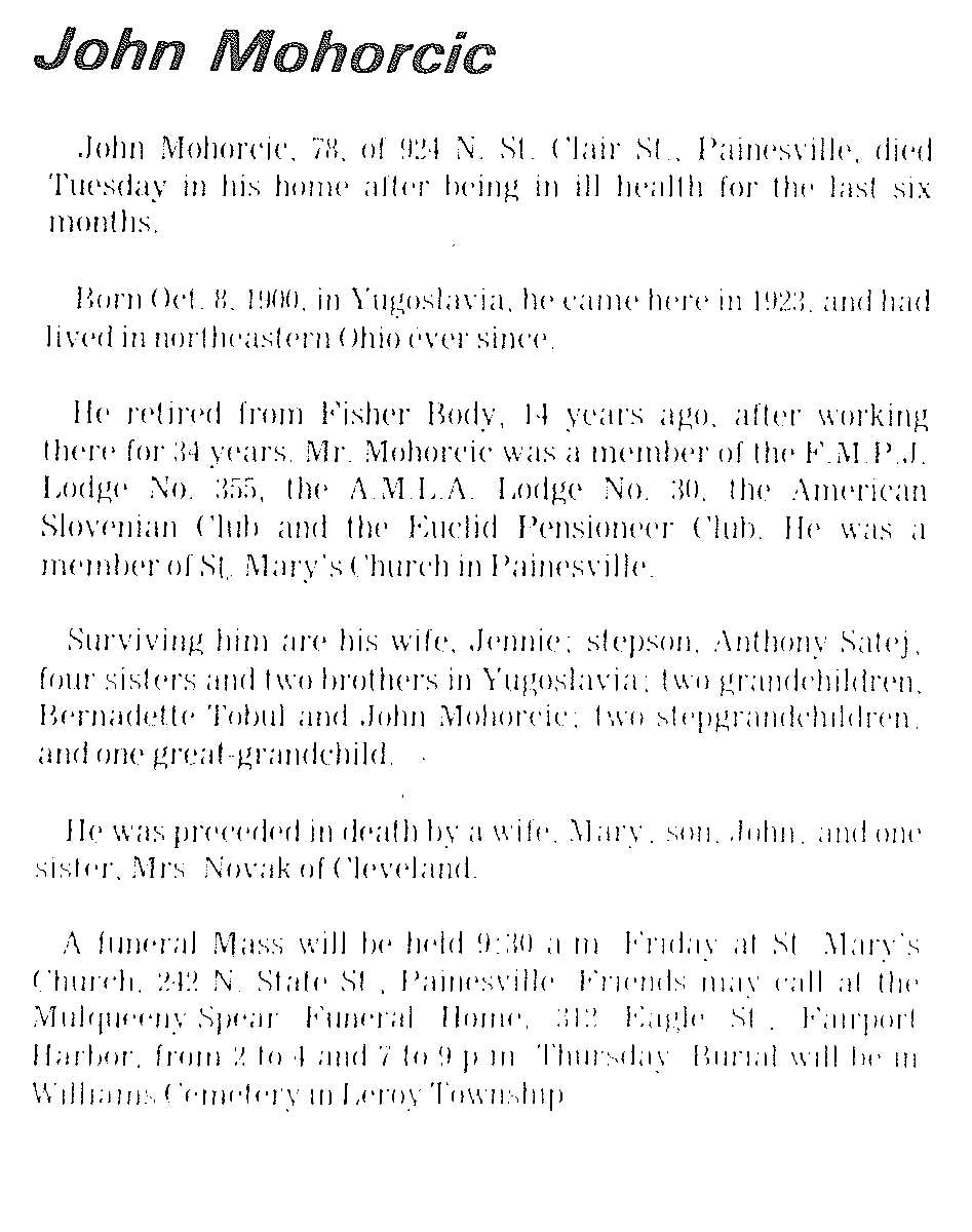 Mohorcic, John Obituary, Mohorcic, John Obituary (Telegraph 02/14/1979)